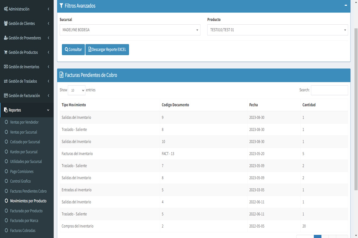Obtén un registro completo de todos los movimientos realizados sobre un producto específico, incluyendo compras, ventas y traslados entre sucursales, para una gestión más efectiva del inventario.
